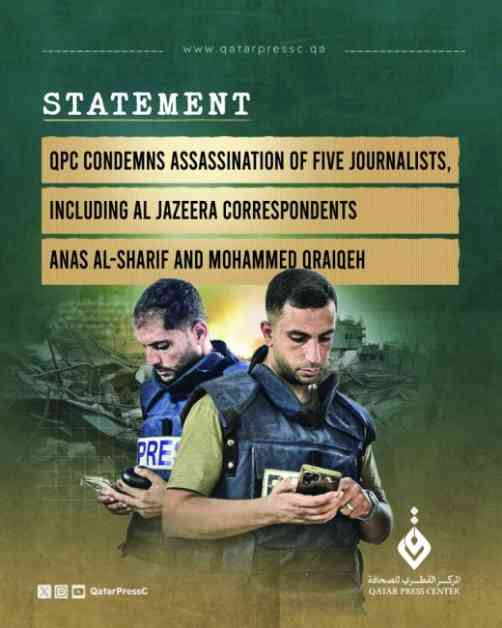 عندما تعرضت الصحفيين أنس الشريف ومحمد قريقع من قناة الجزيرة للاغتيال، وتوفي كل من كان يعمل كمصورين إبراهيم ضاهر ومحمد نوفل ومؤمن عليوا نتيجة لقصف إسرائيلي متعمد على خيمتهم أمام المجمع الطبي الشفاء في قطاع غزة، أدان مركز الصحافة القطري هذا العمل بأشد العبارات. يؤكد المركز أنه منذ بداية العدوان على غزة، لم تتوقف الحملة التحريضية الممنهجة ضد الصحفي أنس الشريف من قبل المتحدث الرسمي باسم جيش الاحتلال الإسرائيلي أفيخاي أدرعي ومنصاته، وقد تصاعدت في الأيام الأخيرة بتهمته بالإرهاب.