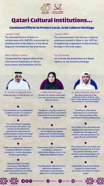 استنادًا إلى التزامها بالحفاظ على التراث الوثائقي وتعزيز التعاون الإقليمي، أعلنت الأرشيف الوطني في قطر، بالتعاون مع اليونسكو، عن إنشاء اللجنة الإقليمية لذاكرة العالم للدول العربية. وجاء الإعلان خلال مؤتمر إقليمي استضافته الدوحة في يناير 2025، بهدف تعزيز التعاون في مجال التراث الوثائقي في المنطقة العربية.